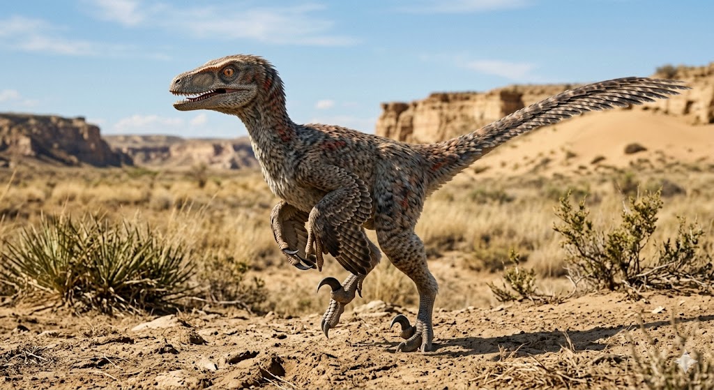 体長約2m、体重15kg程度の小型で細身の体型を持ち、前肢に羽毛の痕跡が確認され、全身に羽毛が生えていた可能性が高いです!群れで狩りをするかは不明ですが、知能の高さと敏捷性から戦略的な捕食者だったとされます!